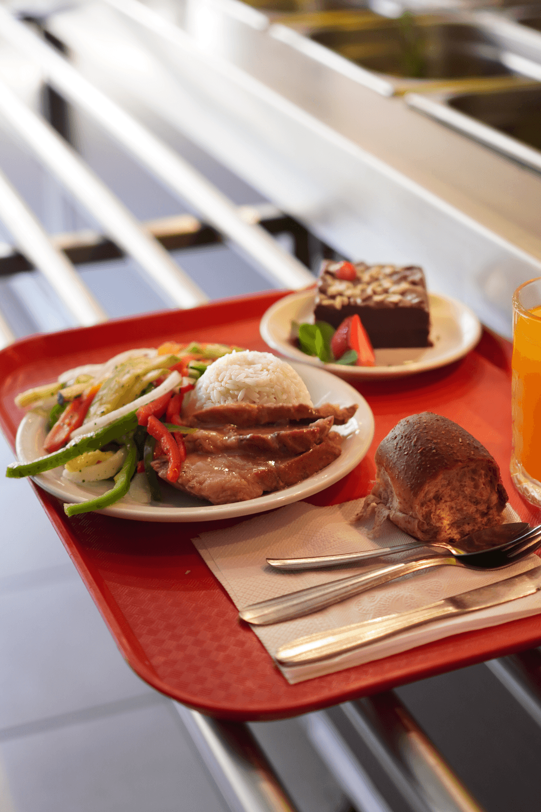 Bandeja con coloridos manteles, con vajilla a escala de los niños de tamaños adecuados a su edad y dispuestos bajo pautas ergonométricas para el óptimo desenvolvimiento y consumo de su almuerzo.